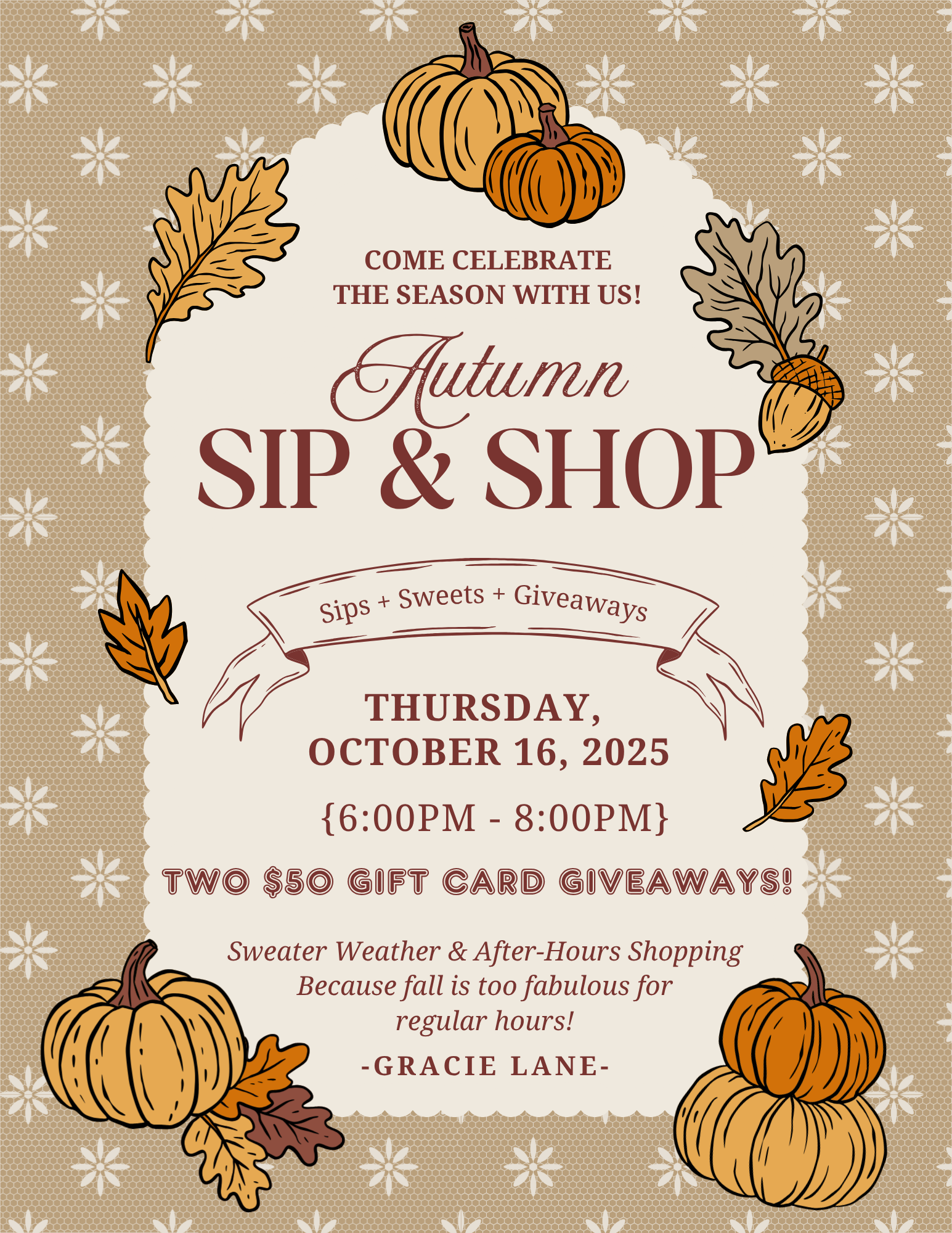 Come celebrate the cozy charm of the season with an evening of after-hours shopping, sweet sips, tasty treats, and fabulous giveaways at Gracie Lane!